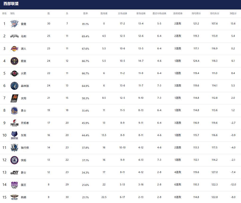 1-3名:雷霆(30胜7负)、马刺(25胜11负)、湖人(23胜11负)